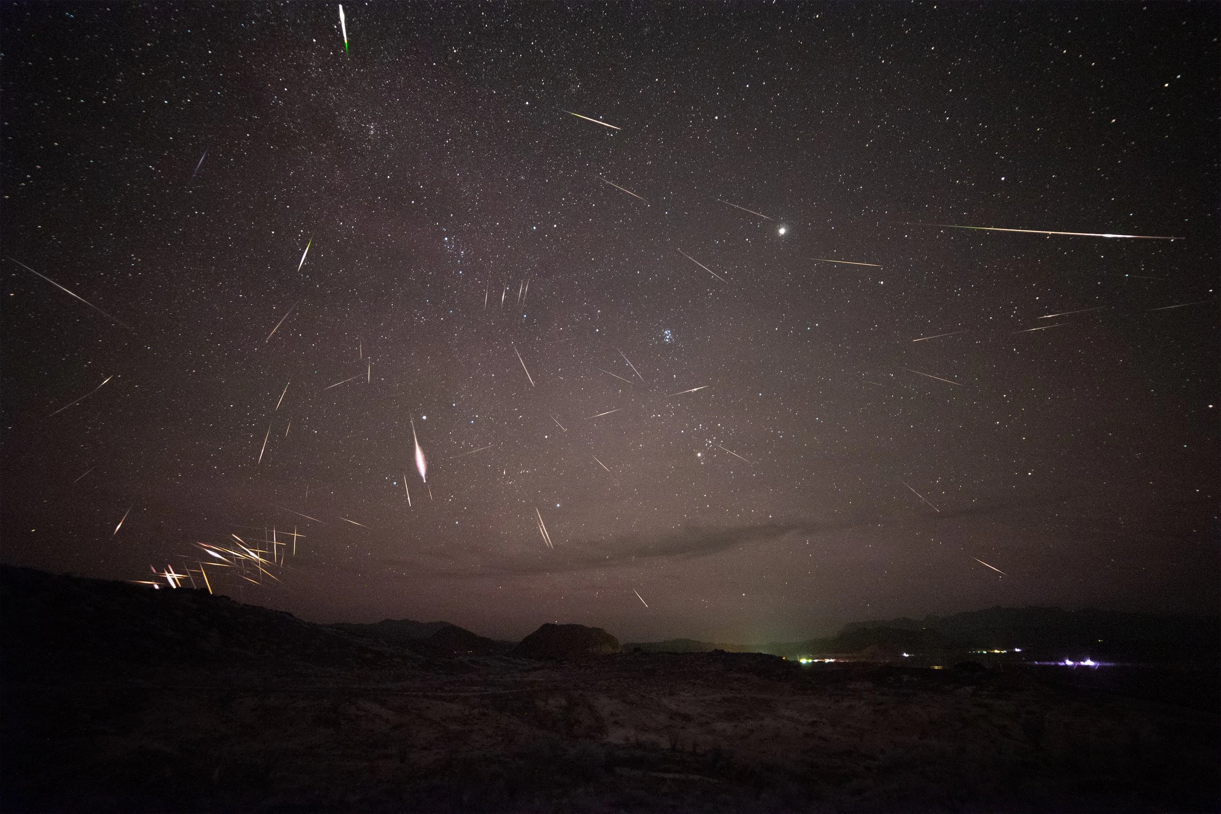 A composite image capturing about 3 hours of the meteor shower on the morning of August 13, 2023 from Terlingua, TX.
